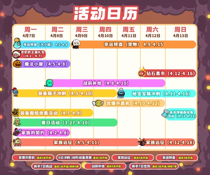 亲爱的宫爆家族成员们🌸家族远征玩法已开启报名,将会在本周正式开打春日游戏进入倒计时阶段,还没参与活动的记得速速前往参与!新鲜热乎的活动日历来耶!来看看本周的活动排期吧!📅 【活动播报-文字版】✅ 宫爆许愿机 4.10-4.12✅ 充值返利 4.1-4.28✅ 装备箱子冲刺 4.5-4.10✅ 秘宝宝箱冲刺 4.11-4.16✅ 装备图纸收集活动 4.7-4.9✅ 电池增幅器收集