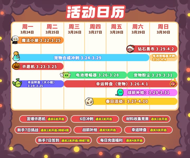 亲爱的宫爆家族成员们🌸3月最后一周的狂欢日程已加载完毕!超多福利、限时冲刺、许愿好礼统统安排——快收下这份「躺赚指南」,和管家一起上线狂嗨吧💥📅 【活动播报-文字版】✅ 宫爆许愿机 3.23-3.25 ✅ 宠物合成冲刺 3.24-3.29✅ 电池增幅器冲刺 3.30-4.4✅ 电池增幅器获取 3.26-3.28✅ 宠物粉尘获取 3.29-3.31✅ 战前补给 3.29-3.31🔥