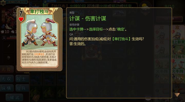 之前的版本日志发出来后,有玩家会担忧敌方【单打独斗】在后期对我方造成伤害过大,后面决定对【单打独斗】增加一个伤害上限,以下为规则:【单打独斗】: 对2距内目标使用,由目标先开始轮流打出【任意攻】,无法打出则受到对方2倍武力的伤害,无视计谋增伤与减伤(包括谋防),至多造成对方33%兵力上限的伤害。为什么会调整【单打独斗】呢?1.之前计谋类武将很容易比攻击类武将打出更高的伤害,觉得有点不符合这