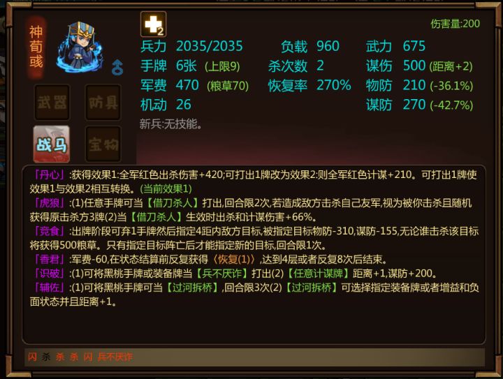 防御型武将“韩当”即将在闯关杀最新版本中登场。韩当长于弓箭、骑术并且膂力过人。历仕孙坚、孙策、孙权三代,随从其征伐四方,功勋卓著,对江东基业的逐渐稳固和吴国的建立有着重要影响,被陈寿盛赞为“江表之虎臣” 。官至昭武将军、冠军太守,加都督称号,封爵石城侯。人脉还在设计中...神将满级技能效果(未突破,最终数值可能有出入):「骑射」:出牌阶段可弃1手牌使得出杀距离+1;若装备坐骑再获得6移动力