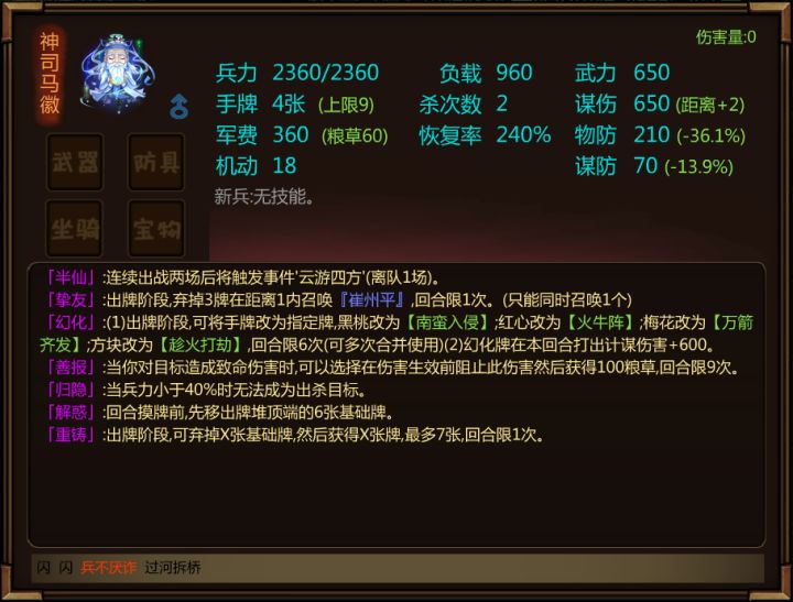 计谋型武将“司马徽”即将在闯关杀最新版本中登场。为人清高拔俗,学识广博,有知人论世、鉴别人才的能力,受到世人的敬重。司马徽加入诸葛亮、庞统人脉中。司马徽、童渊组成新的人脉。注意:司马徽不能通过募將符直接获得。获取途径:1.通过随机事件集齐5部残卷后有随机解锁童渊或者司马徽。2.获得童渊(司马徽)后通过云游事件解锁司马徽(童渊)。神将满级技能效果(未突破,最终数值可能有出入):「半