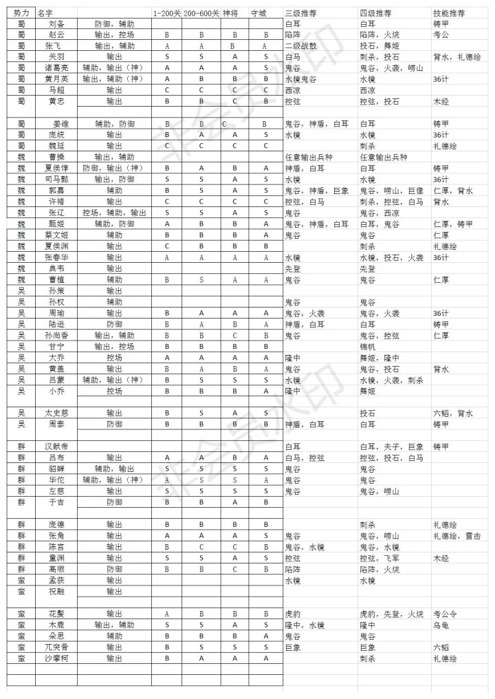 Ps:S级是核心,A级是强于平均强度,B级是平均强度,C级是弱与平均强度,这个是以满技能对比。一般来说C级武将建议换将换掉,在Qq群里偶尔有萌新说许褚用着还可以,许褚的技能对于萌新来说是简单实用,但伤害倍数低,在打到100+关技能升满的时候非神,强度基本低于大部分攻击性武将。这个分等级SABC也算是解决部分萌新换将不知道换哪个。部分武将强度是基于兵种的,例如太史慈,用投石是S级,用别的任意兵