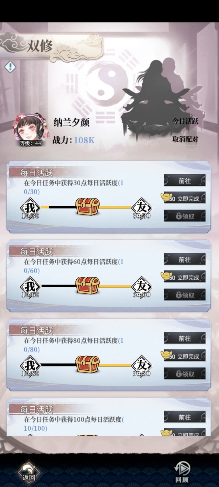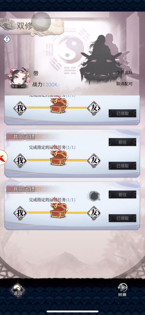 视频是我的双修任务,截图是我双修好友的,他一个人做了两遍运镖领了两次奖励,活跃、信物任务也只能他领,我这边根本没更新,都是昨天的状态