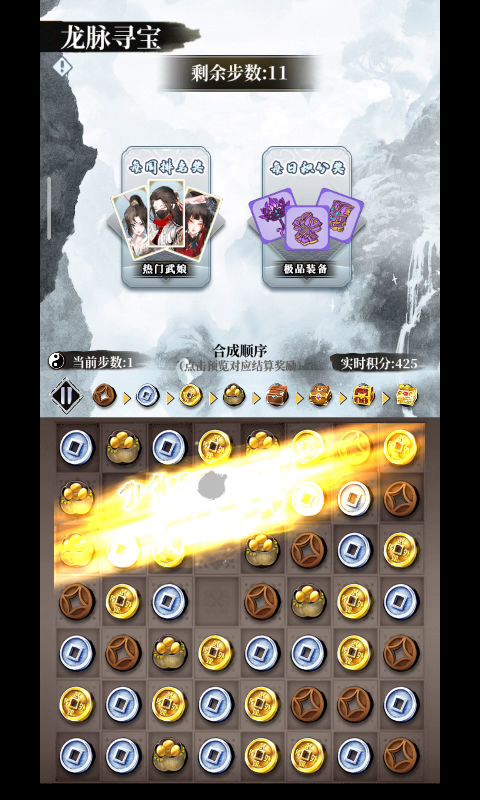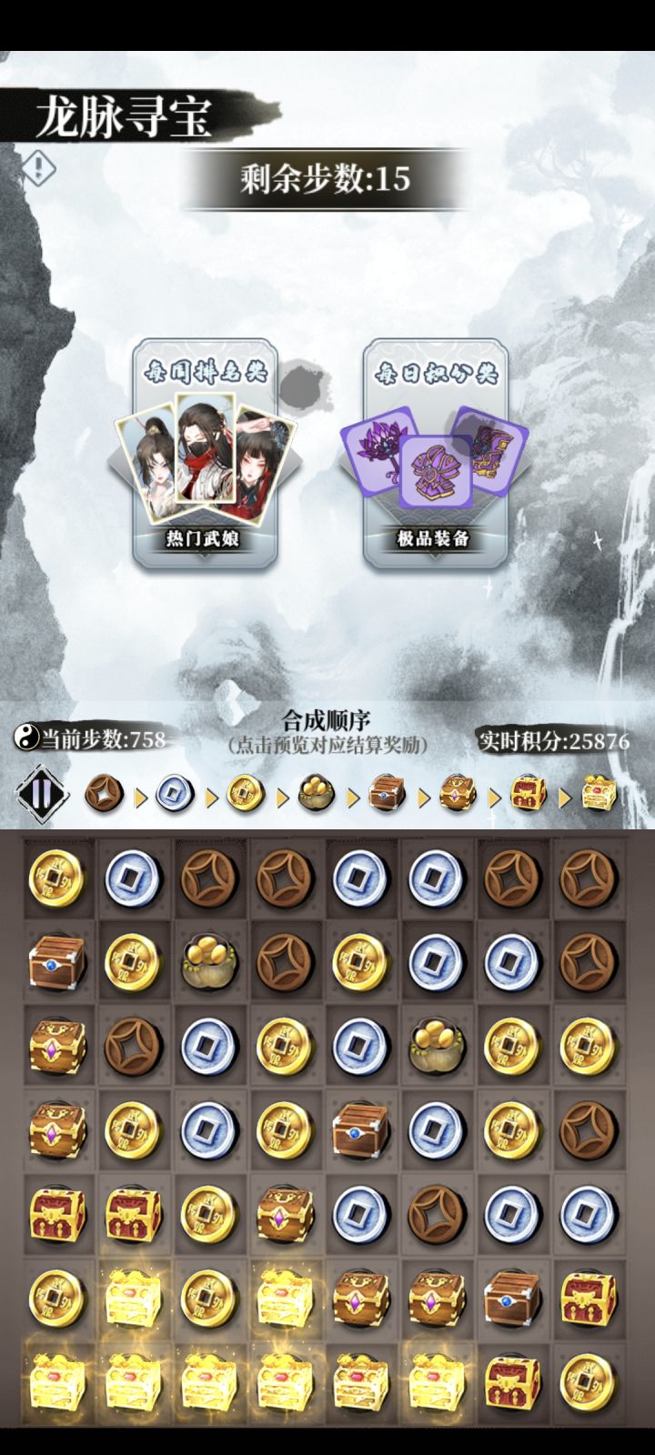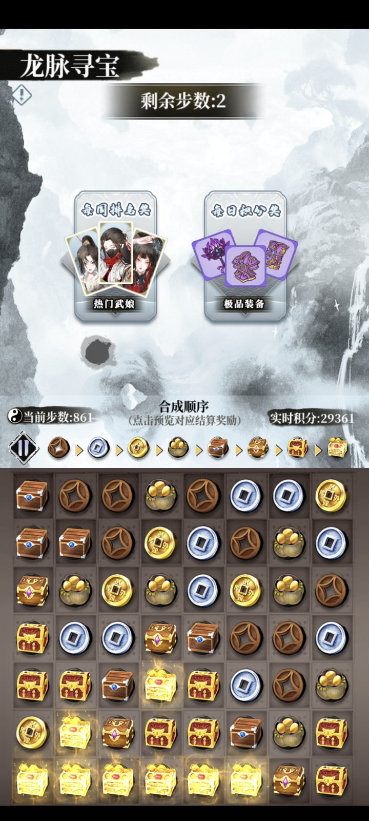 龙脉寻宝攻略(极简版)有没有用我不知道,但短就完事了。以下为本人龙脉寻宝消和的主要思路,想要学习具体操作请移步奔波霸大佬发的龙脉攻略长贴。龙脉寻宝术 主要靠思路一为保棋型 二为增步数消下不消上 消左再消右箱子向下搬 钱币往上去堆积莫太高 小钱攒一起小箱压大箱 中下除铜币五连要珍惜 四连懂放弃心态放平和 消错莫生气棋型可以理解为整个棋盘界面越整齐越美观越接近初始棋盘就越好。
