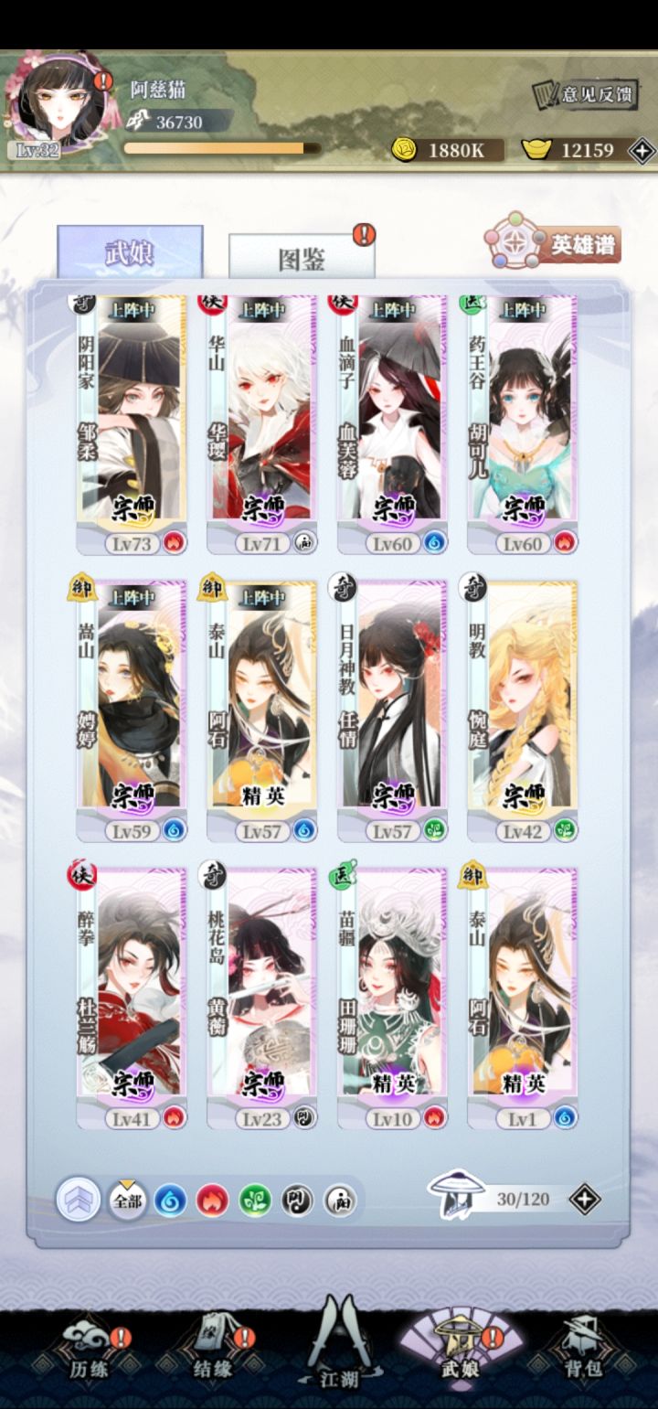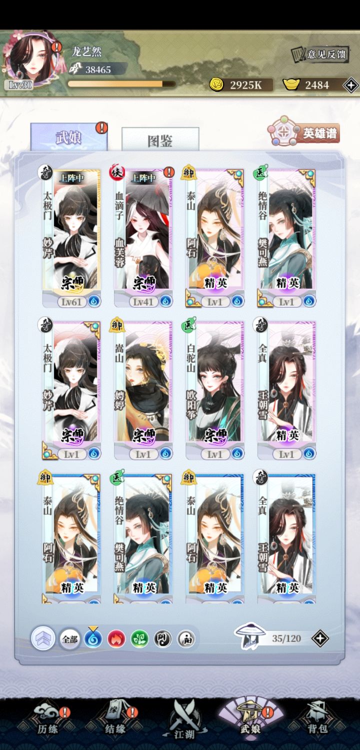 纯新人,自己的感想,错误勿喷!首先游戏需要双奶,问就是BOSS关都是切后排。死的不要不要的。我推荐水系阵容。太极门+白驼山+嵩山+小药仙标配。主C队长最好是武当。姑苏慕容也成,剩下那个可以是血滴子也可以第四天送的那个,叫什么忘了。我3金的阵容已经重生了。可惜资源太集中在水系了,升星好难。最后吐槽下,阴阳太难抽了,300抽就一个wd。玩个锤子呀