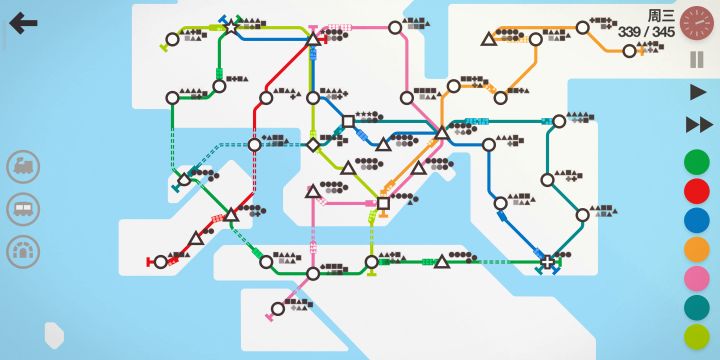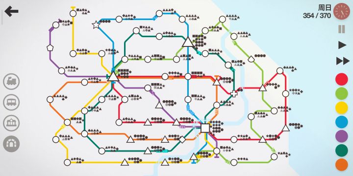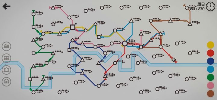 纽约要求利用换乘站和2条以下线路运满1600人。这个我用2条固定线路随便怎么试,1000到头了,客流挤爆。于是我用了一个比较极限的方法,一条大长线+各种临时短驳线。前500人,随便怎么排线,等到了500时,站点出现的差不多了(如图右上角一大堆圆,肯定很容易堵),这时候全部拆了,重新安排大长线,要求相邻的都不一样并把特殊站点包含其中。每周奖励优先级:枢纽>车厢>隧道>线路大长线安排好了以后,