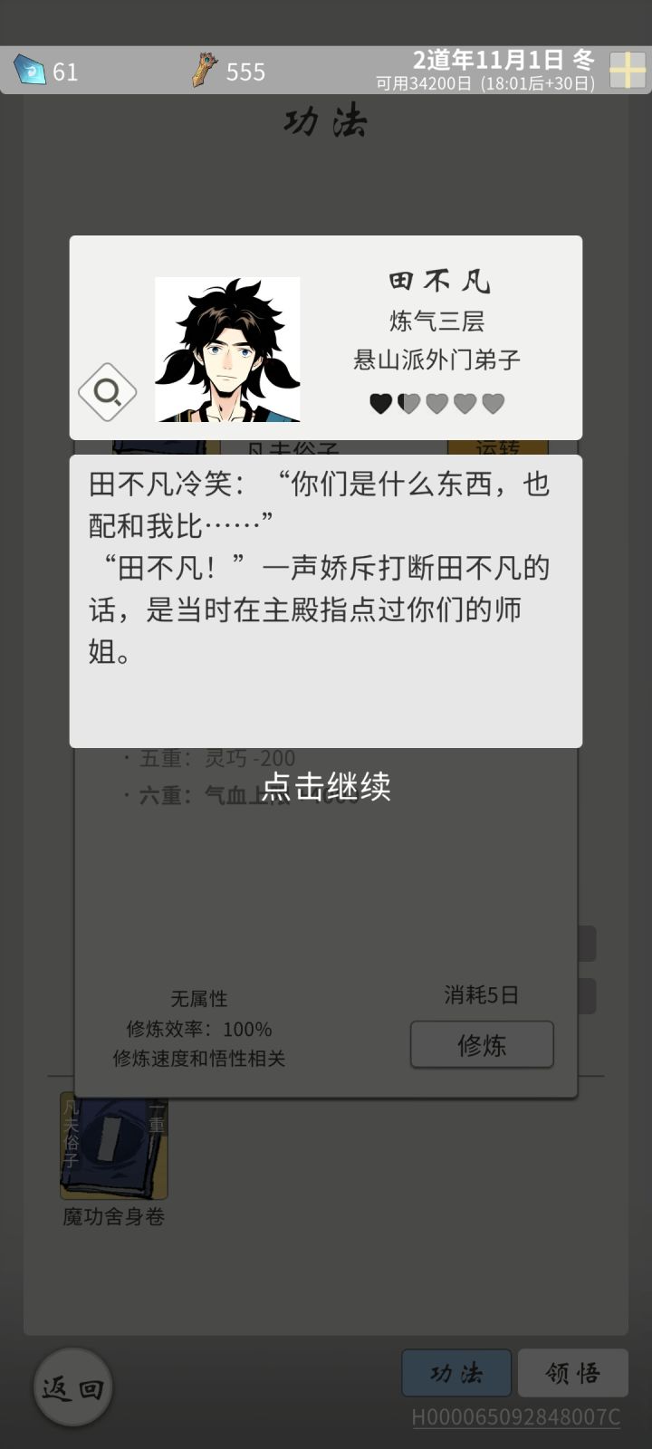 摸鱼萌才练气一层居然敢去炼血福旺巢穴!莫不是隐藏了修为!也是,修行路上危机重重,只有这样才能自保,赶紧把她收为老婆之一————————————————————这个小号是为了试上次发的贴的一些东西,但是大师姐怎么变成大师兄了啊喂!?练气八层变十层,女变男?还是每个号大师姐都不同?但这样剧情不对啊,有个剧情是被田不凡打的,就是田不凡说我进步很快,他要领教领教,我被打了之后会有一个上