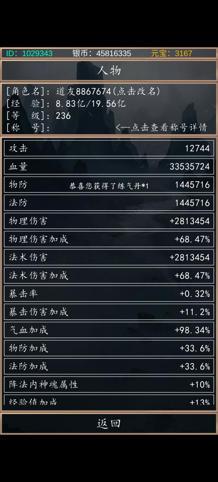 注:此游戏为佛系游戏,不喜欢的玩家可以先行离开,下面进入正题😊游戏基本玩法:偷装备,挂妖王,买套装,偷装备,挂妖王,买套装....1.兑换码VIP888,另外几个游戏公告里面就有2.元宝:主要通行货币,绝对不可以胡乱使用,前期可以用来买套装(主要),阵法,羽毛。挂妖王会给一元,五元(200级妖王以后)红包,3.法宝:没啥卵用,前期不用买,送的一个阵法就可以,升级靠白嫖4.技能:没有额外