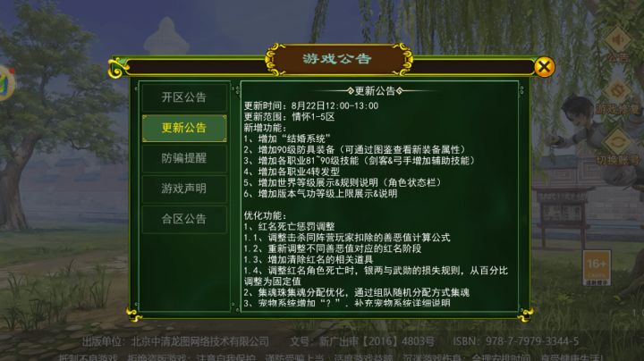 更新时间:8月23日 11:00-12:00更新范围:全区下载地址:新增功能:1、增加“结婚系统”2、增加90级防具装备(可通过图鉴查看新装备属性)3、增加各职业81~90级技能(剑客&弓手增加辅助技能)4、增加各职业4转发型5、增加世界等级展示&规则说明(角色状态栏)6、增加版本气功等级上限展示&说明优化功能:1、红名死亡惩罚调整1.1、调整击杀同阵营玩家扣除的善恶值计算公