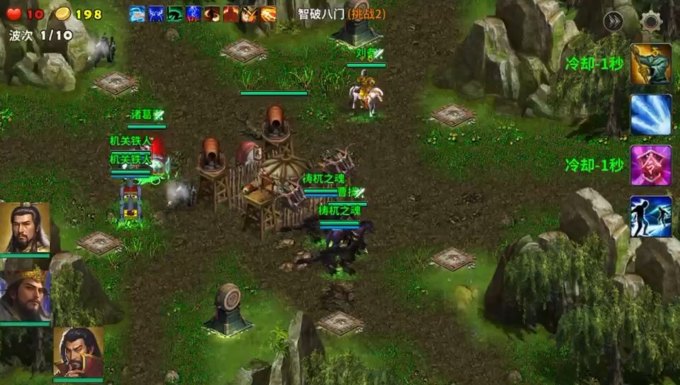 难度关虽然增加了敌人的攻击,血量等,但是难度关kt随意选择出场英雄这对玩家很是友好,这一个的首通出场选择了刘备和曹操。本身就两个英雄了,再加上刘曹召唤的士兵协助,可以把敌人的士兵都给截住攻击不到刘备,让其有充足的时间和生命力到达左上目标位置获取三胜利。