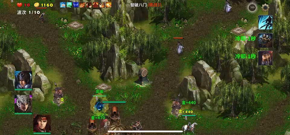 剧情过后就可以任性选择武将打难度关卡了。难度1到3难度基本差不多,给的首通奖励要拿的,选择自己喜欢的武将,威力大的塔防进入游戏,死守中间的大本营防止敌军摧毁。武将分开站在大本营周围抵御敌军。四周所有塔基建塔后升级,没有庞德的尽量不要开三倍加速。平速稳扎稳打才能过。此关武将最后一波左边出来,击败就可以获得胜利。