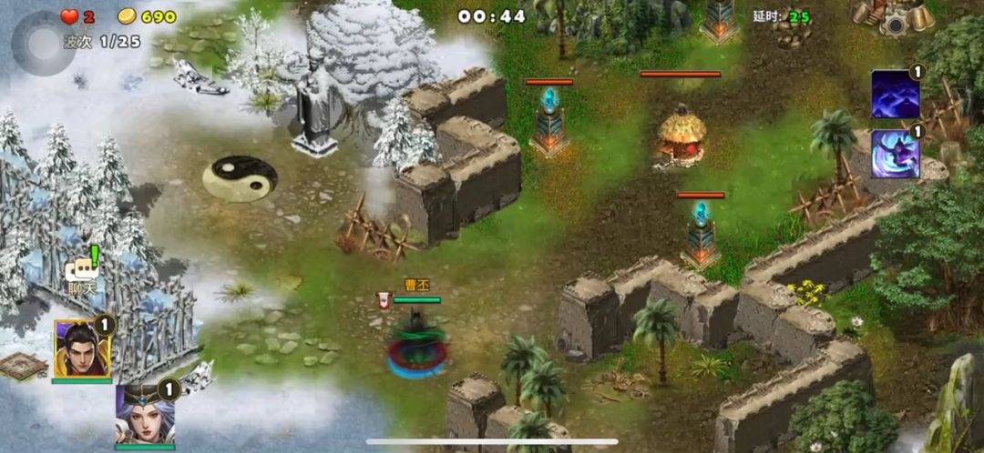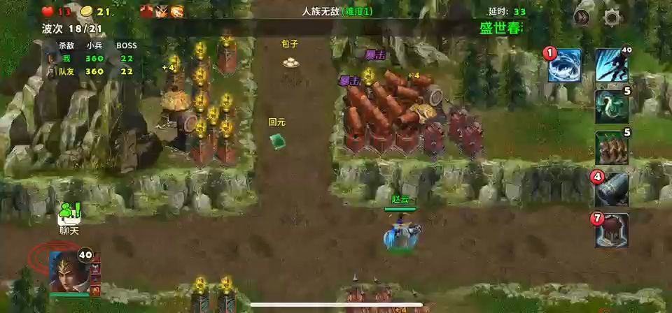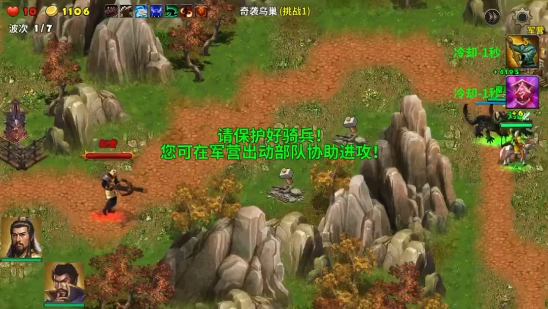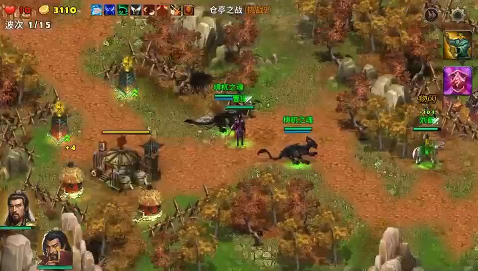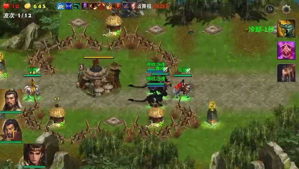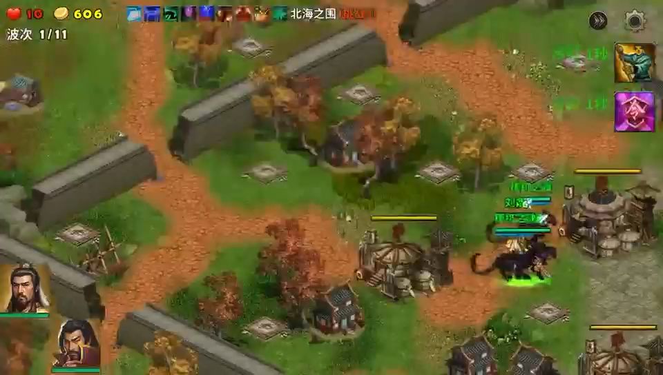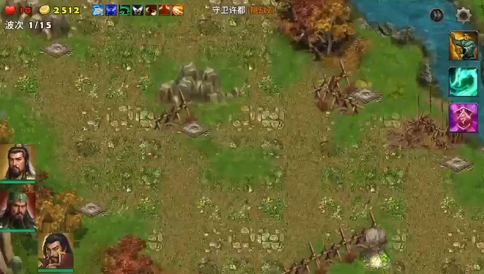 这局地图很好玩,进攻的敌人很多,一波一波的敌人还有多兵种混合的编队进攻,选三位英雄就守着营寨不用出击,把两个系统送的滚石塔升满级,周边的塔基就建造天雷塔,战斗中留意敌人投石车,它能远距离打我们的塔防,发现就派英雄上去杀掉,最后一轮敌审配出现击败就过关了,很好玩防御战。