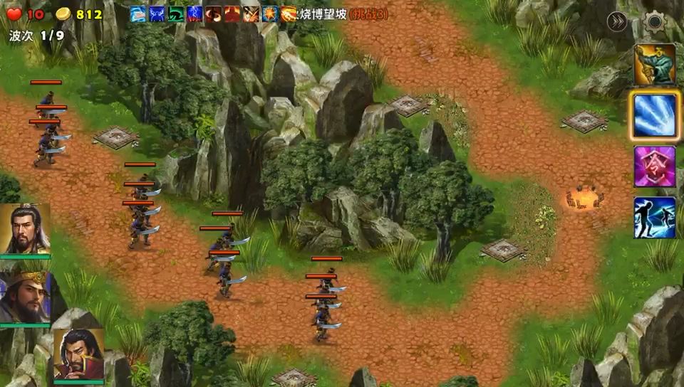 很好过的难度地图,只要是守住一个角不让敌人攻击到我方的大本营坚守住敌人的9轮攻击即可获胜,地图中可以选择三位英雄,进入英雄就防守在大本营上面的口上,两侧用天雷塔加固一下。只要英雄有等级敌人是进不了大本营的,随着杀敌奖励的金币多起来再建造外围的防御,充分说明了英雄等级的重要性。