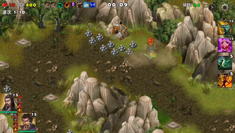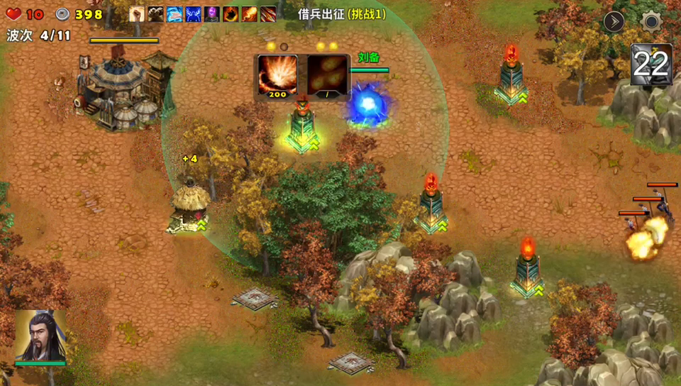 这局塔防就选火焰塔,也可以辅助的选弓箭塔,开局建塔最好一个完工后再建另一个,别一下子都建造起不成形的塔防,导致哪一个塔防都没用攻击性,造赞就造最好的,攻击力大大的,武将待机御敌辅助,三星没问题的。
