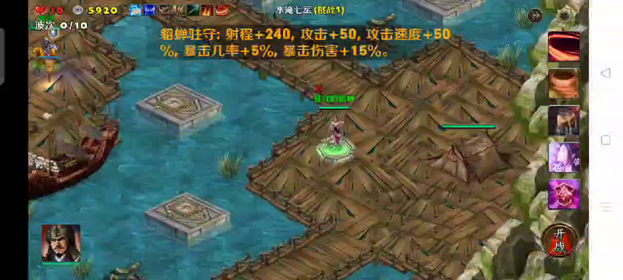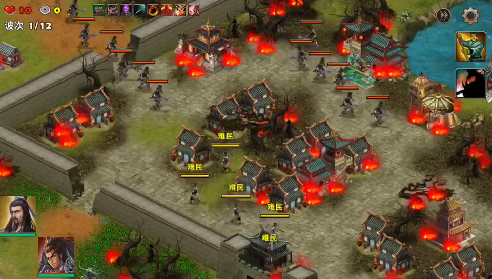 开局选用的塔防是火焰塔和弓箭塔,先里敌人出兵的地方建造起级个塔防配合所选的武将杀敌。后面金币积累的多了再强化所建造的塔防。弓箭塔防在前消耗敌人,火焰塔防在后消灭敌人,武将待机补刀漏网之兵。