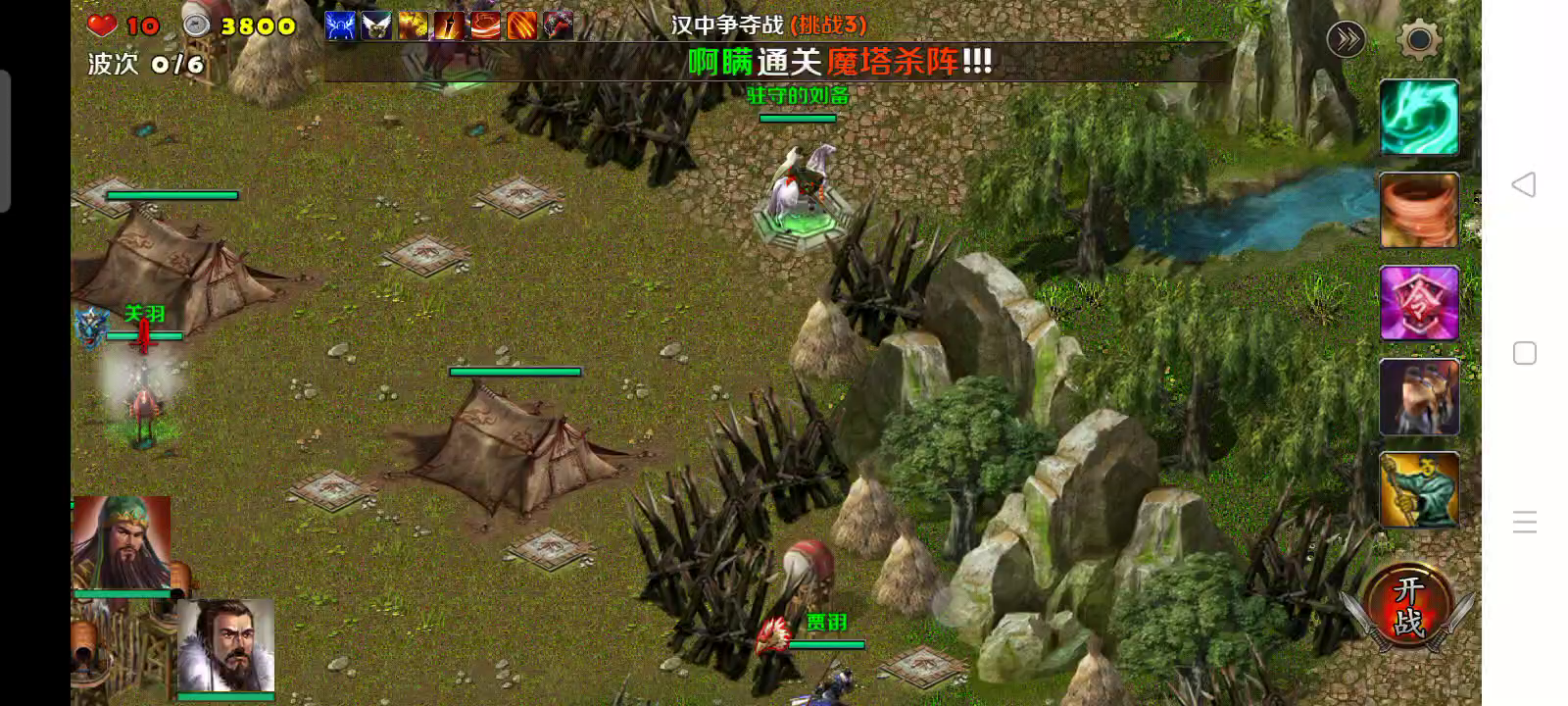 这一局开局我选了曹操刘备和黄月英,有兵有将有机关牛的我。没开始之前就奠定了胜利,开局就把三将布置在大本营的边上,四周建造了交叉火力的火焰塔。敌人三路进攻的汇合处我都下好了套,开始后敌人没有一个漏网。完美三星~~!!