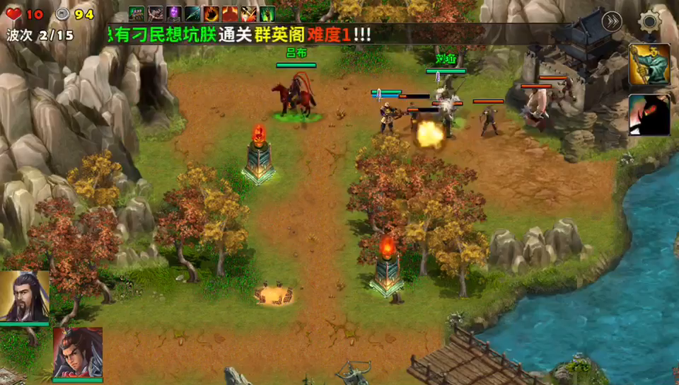 为了升级,挑着地图看,这一局敌人就一个出兵大本营,我用的火焰塔,吕布武将站在敌人分兵口待敌,搭配上我的火焰塔,基本没有漏掉的小兵,在敌人山洞的出口再建造一个火焰塔就万无一失了。正面战场有个火池,当敌人兵力多的时候,可以把武将退回这里后等敌人聚拢后防火,可以大礼杀伤敌人~!!!!!!!!