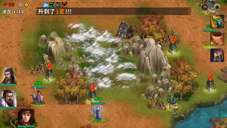 这一局是挺难的,本人推了2次,这次才过的,开局选三个武将,我选的刘备,关羽,带了一个诸葛亮,塔防用的火焰塔,敌人进攻一共10次。四面进攻,搞得挺头疼。建议不要用加速打,最后的BOSS是个大乌龟。打掉他就过;