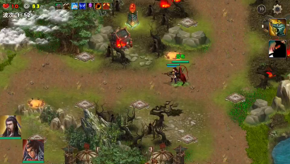 开局选两个武将,我选的是刘备和吕布,也是为了能升级涨点经验,这局没难点,两个武将守住敌人的出兵口,从敌人大本营的起点开始,就近的建设火焰塔。火焰塔为了就是收割漏网的小兵,一个共12轮敌人攻击,最后是张宝出战,两将杀一将。4只拳头揍两只拳头,不打爆他头才怪。