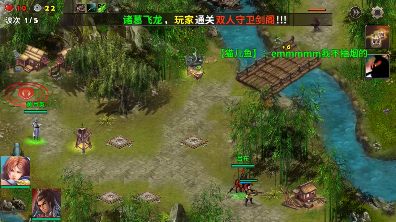 这一局用关羽单挑,让关羽一将斩了华雄,还原历史。开局火焰塔和弓箭塔快速建造来杀伤小兵,关羽机动作战,就是哪里吃紧增援哪里,最后一轮华雄华大哥会出来,找个靠着我放火焰塔的地方送他走,这样会好打一点,恭喜你通关