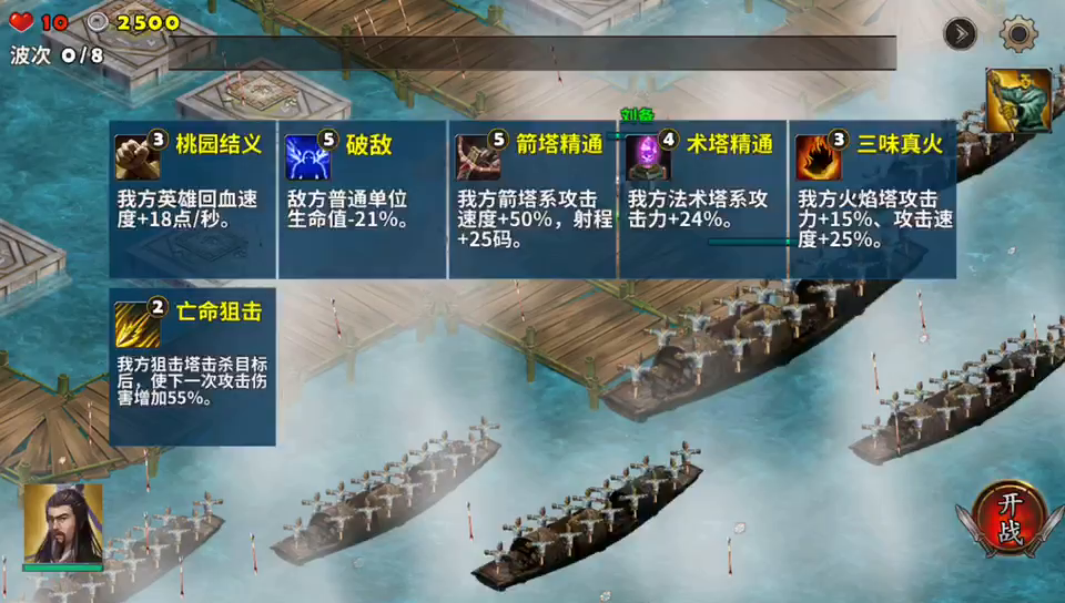 有点难度,开局敌人坐船来攻击大本营,可不能让敌人登岸,登岸后满满的小兵头就大了。开局赶紧在敌人出兵口建设一个毒箭塔,减速小船,造远程建塔杀敌。水上的建塔建完了再建大本营周围的,最后2个武将,带一群小兵,尽量不让小兵登陆,两个敌将好杀