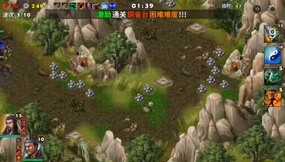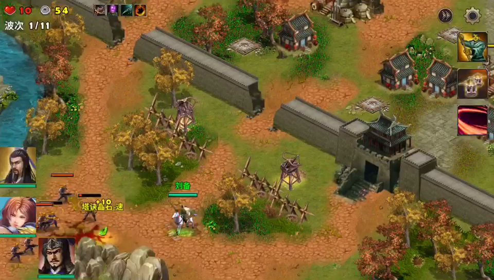 这一局开局可以选毒箭塔和火焰塔。毒箭塔可以给敌人的移动减速,火焰塔打击敌人,只能选两个武将,感觉强一点的武将在右边的2个出兵口阻击一下敌人,另一个武将在右下消耗敌人兵力,大将在前,强弓火焰塔在后,基本不难