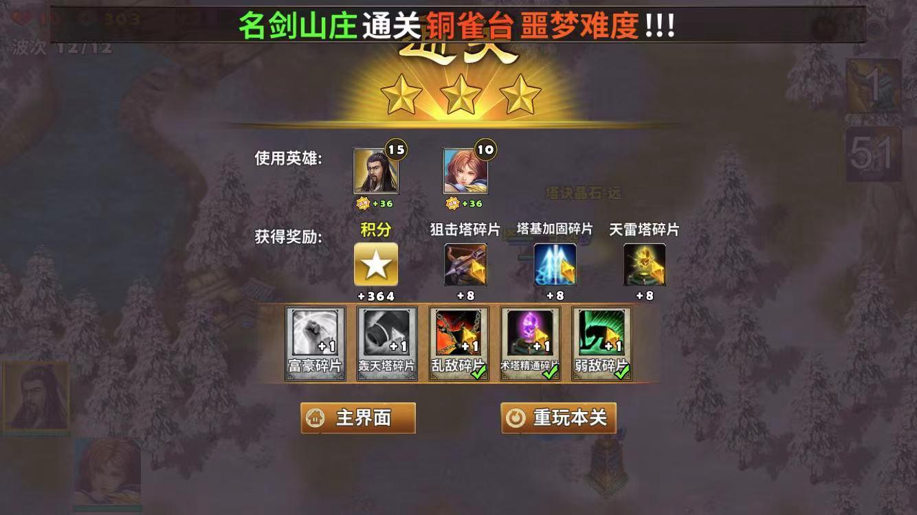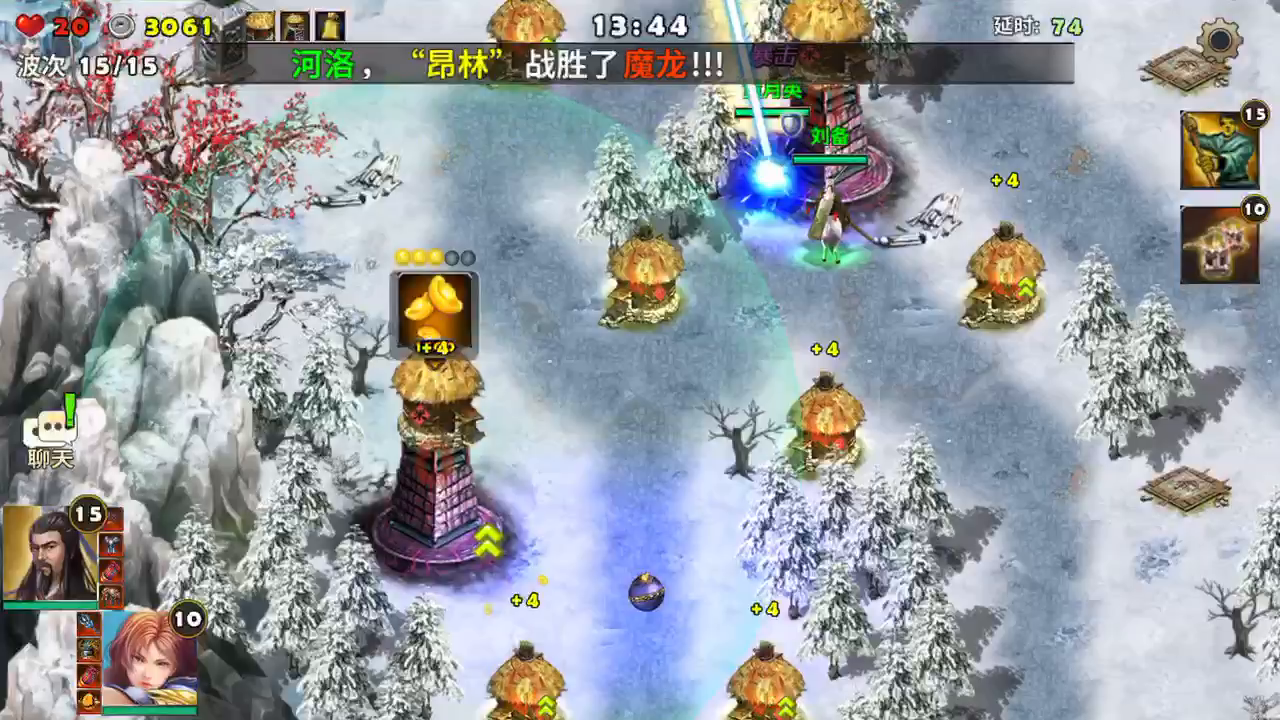 这一局感觉有点难度,敌人从4个城破的入口进城打我们的大本营,最多选三个武将防守,建议成立密密麻麻的建造攻击力高的火焰塔,城外就使用远射程的箭塔来防守。小伙伴们瞪起眼球子打吧,别让小兵溜进来就行,我打了2次才过的,首通啊首通~!