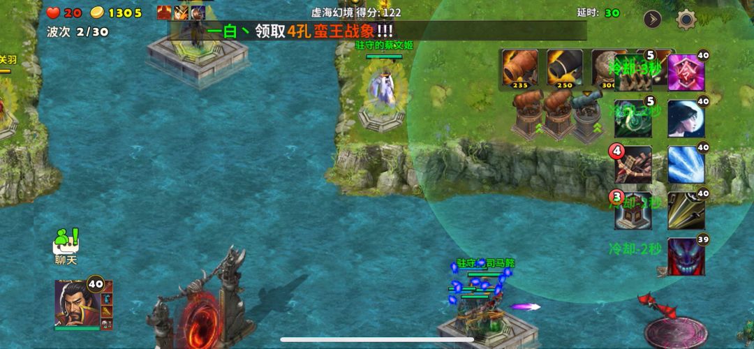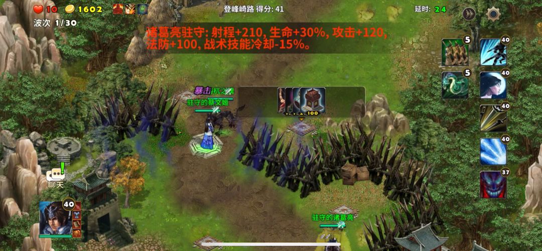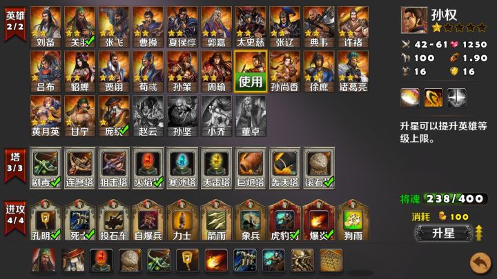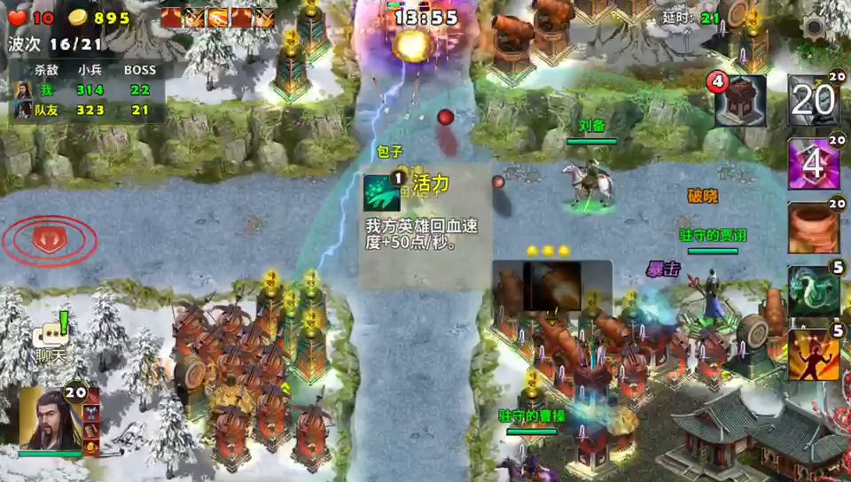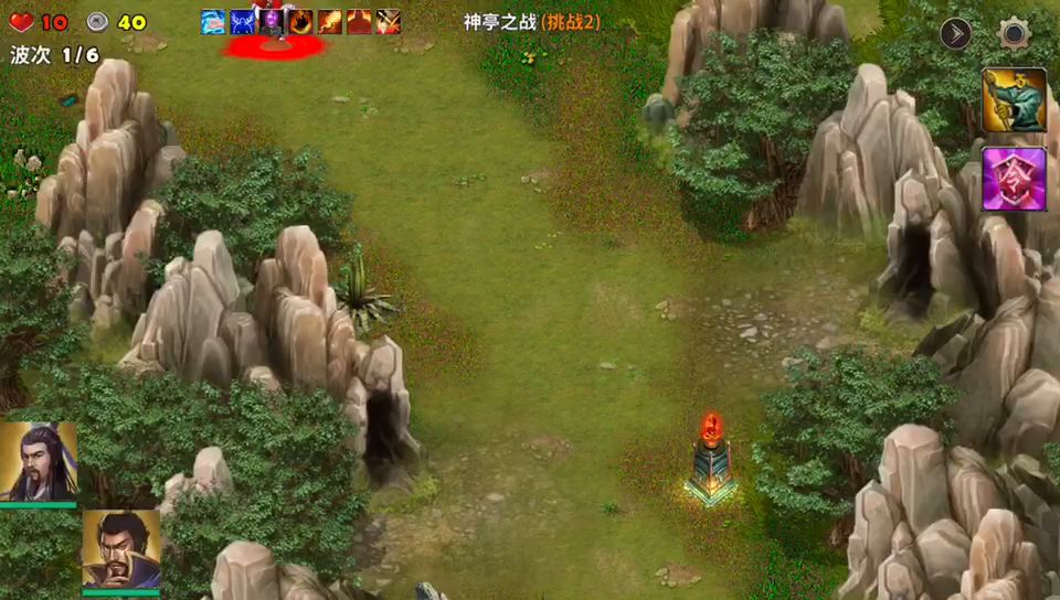 塔防:策马守天关~守卫许都 胜利条件:击败审配和所有来犯之敌 参战武将:刘备、曹操、诸葛亮 必选装备:坎蓝宝甲、碧酉鸡 推荐塔防:天雷塔、火焰塔 打法心得:这一关要防守敌人十五轮的进攻,此关敌人出动人马特别多但是都比较弱包括敌将韩猛和审配。许都城外的两座滚石车特别重要优先升级科技能更好的协助防守。武将按视频打法当道扎营待机敌人休想踏进许都。