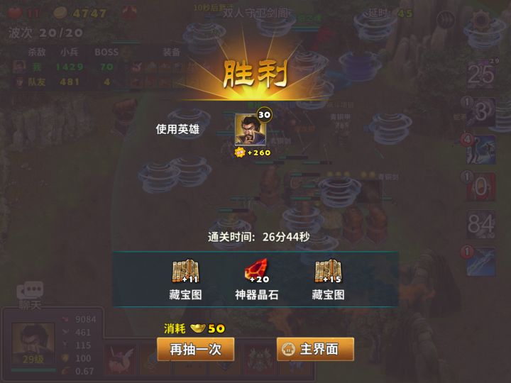 现在活动中的人族无敌,只要你通关,或者是顶住敌人的20轮进攻,就会有一定数量的金币可以拿。打这个图通关还有机会获得高级的藏宝图,开出部分的好装备,趁着有活动,抓紧搞起来,难点就是前面的敌人因为你没有建立完善的防御阵地前,很容易翻车,快速加密集的建造在前期很重要,没有赵云的玩家推荐使用刘备,有赵云的当然是选用神将赵云了,天雷塔加上巨炮能有效的控制住出来的敌人,刘备使用召唤技能可以滞留住敌人,配合塔防