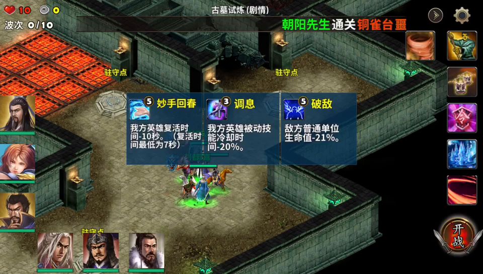 此关选取了刘备,曹操,张辽,郭嘉,贾诩和黄月英将领进行考核,这关不能选用塔防,采用了武将站桩御敌,战术卡用的是破敌,弱敌和复活快的妙手回春。有坎蓝宝甲的都给你所选的武将穿上,能有效的遏制敌人的进攻,基本上打这局难度不大,因为敌人要想打到我们大本营需要闯过这五位武将才行,基本是不可能的,通关视频请参考。