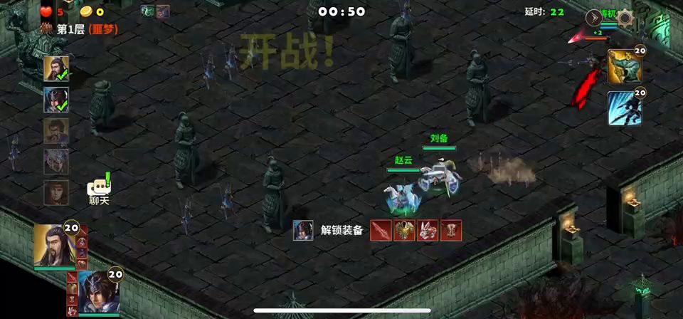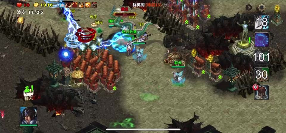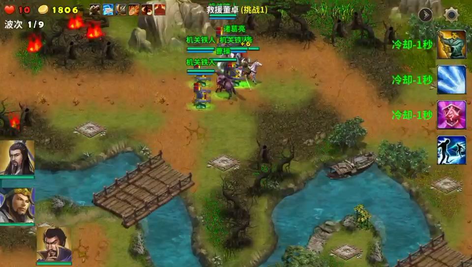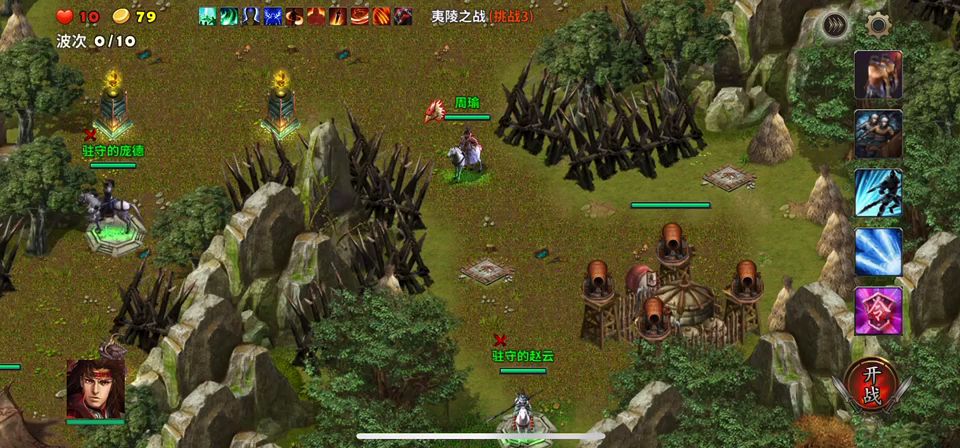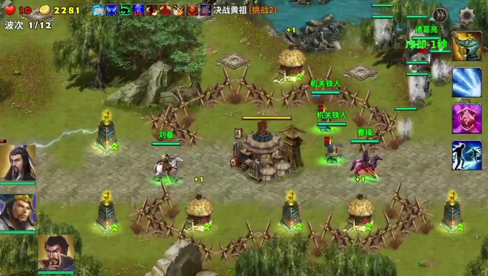 曹操和诸葛亮出战,没有群英阁一样的开局按钮进入游戏即是战斗了,英雄全部快速移动到前方处防守敌人。最前沿可以建造塔防的地方建造巨炮,一排巨炮建造好后再后面建造擂鼓台可以增加攻击还能给旁边的英雄回血。战斗中被击杀的敌人会掉落宝石,这些宝石给前排的巨炮安装后都会按宝石的属性增加塔防的各项性能。远程的宝石会增加打击范围是最好的宝石。请参考视频