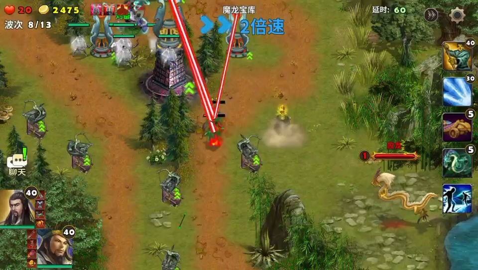 胜利条件:击败免控的魔龙 参战英雄:诸葛亮、刘备 使用塔防:毒箭塔 战斗经验:这周魔龙效应推出的魔眼塔看似高科技塔防其实外强中干,按常规操作建造三个小魔眼塔后积蓄资源再陆续建造两座巨型魔眼塔,由于魔眼塔是逐个打击敌人的塔防对于防卫敌人的蝙蝠冲击实在是力不从心,要快速建造箭塔加强防御才行。小魔眼塔升级科技后覆盖范围会增加一倍建议先小后大的方案升级。巨型升级后能多条射线打击多个敌人。请参考视频