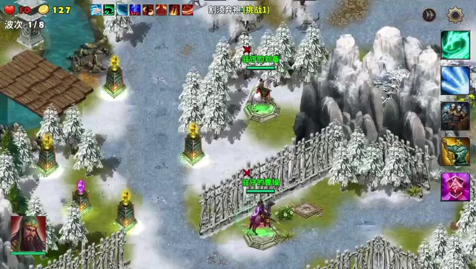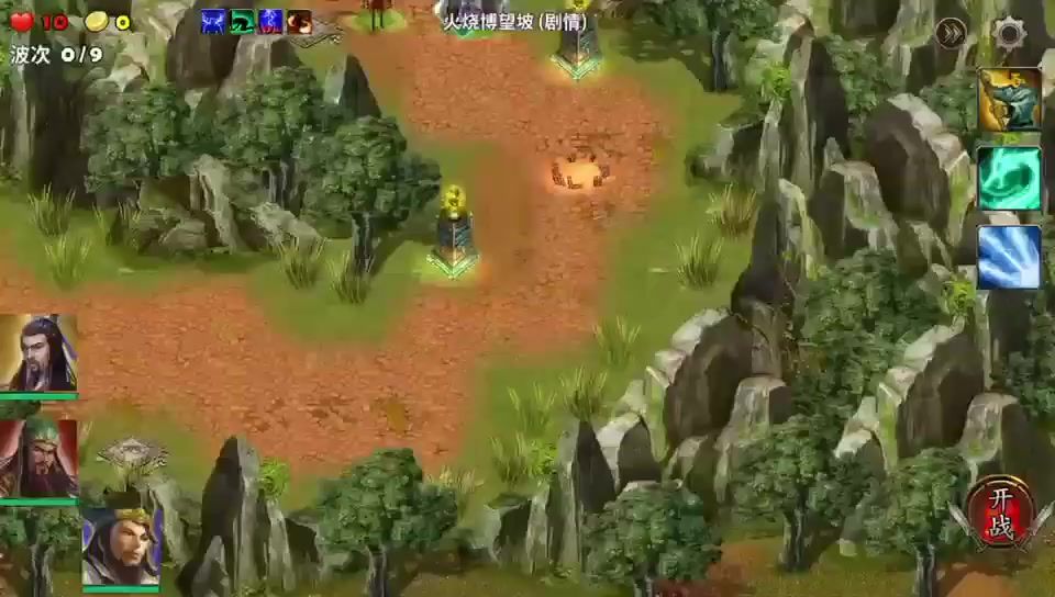 出战武将没有强悍的赵云,清一色的都是基础武将,前沿左边选庞德,右边诸葛亮,刘备站诸葛亮右边,周瑜曹操后方站位,庞德上方天雷塔三座成立体打击,其余塔基全部建造弩箭塔,战术卡选用引雷,妙手回春等,重要是是有召唤祝福卡。开始后刘备白耳兵协助庞德,曹操鹰卫协助诸葛亮。速度升级天雷塔和能打击到敌人的弩箭塔。武将下方的营帐可以回血,总体没有感觉中的难胜利三星通过,请参考视频