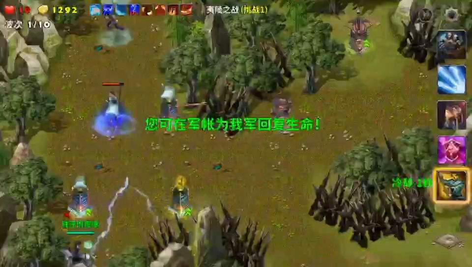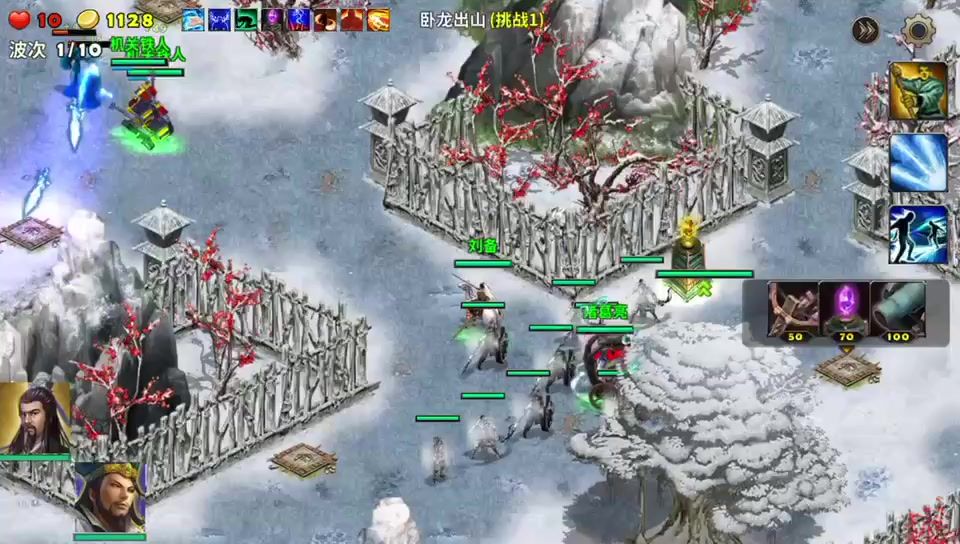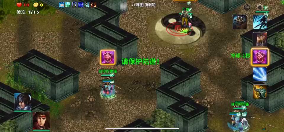 难度1首通选诸葛亮和刘备出战,需要击败河神灵龟的攻击,天雷塔辅助,进入游戏两侧要保证安全建立塔防,正面刘备,诸葛亮辅助刘备同时防守两侧,敌人三路进攻一共10轮进攻,目标是白树,白树被打掉游戏就失败了。战斗中获得资源不断建造塔防,压力也越来越小。注意最后一轮的灵龟,防御很高需要打一会,战力低的玩家可以利用塔防引灵龟进入天雷塔范围击败也行。后面的地图会越来越难,想通关先练将吧。请参考视频