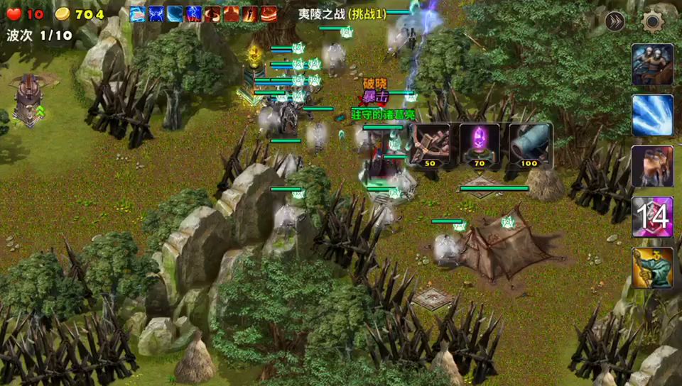 夷陵之战 出战武将没有强悍的赵云,清一色的都是基础武将,前沿左边选庞德,右边诸葛亮,刘备站诸葛亮右边,周瑜曹操后方站位,庞德上方天雷塔三座成立体打击,其余塔基全部建造驾箭塔,战术卡选用引雷,妙手回春等,重要是是有召唤祝福卡。开始后刘备白耳兵协助庞德,曹操鹰卫协助诸葛亮。速度升级天雷塔和能打击到敌人的弩箭塔。武将下方的营帐可以回血,总体没有感觉中的难胜利三星通过,请参考视频