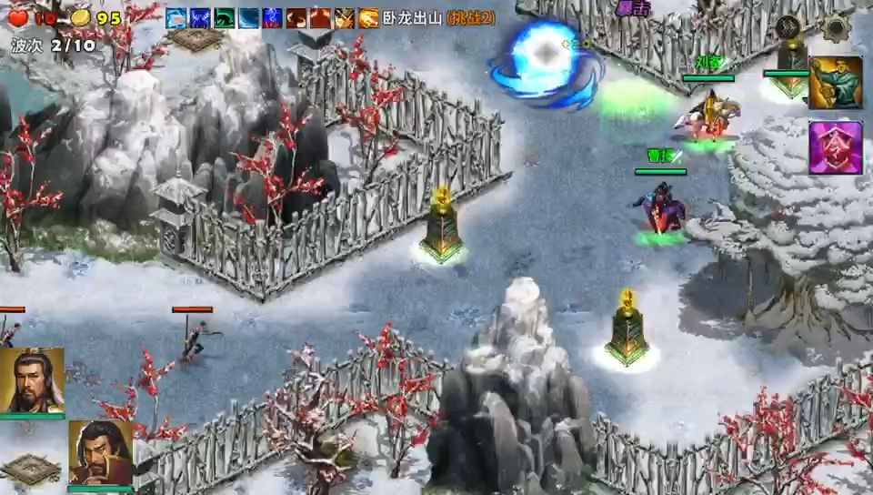 剧情模式通关后得到了诸葛亮,难度关就可以自由选择武将了,推荐打难度关用刘备曹操,有条件的玩家可以把碧酉鸡,神射令,祷杌之眼等这些可以在战斗中形成作战单位的装备都给刘曹配备上,再加上两个英雄自带的召唤技能,基本上难度关轻松过,召唤祝福卡属于限量战术卡,有则锦上添花,没有也无关紧要,战斗中塔防的建设应先建造两侧小路,中间交英雄守卫,随着后面资源的增加塔防全部建造完毕,过关也就是时间问题了。