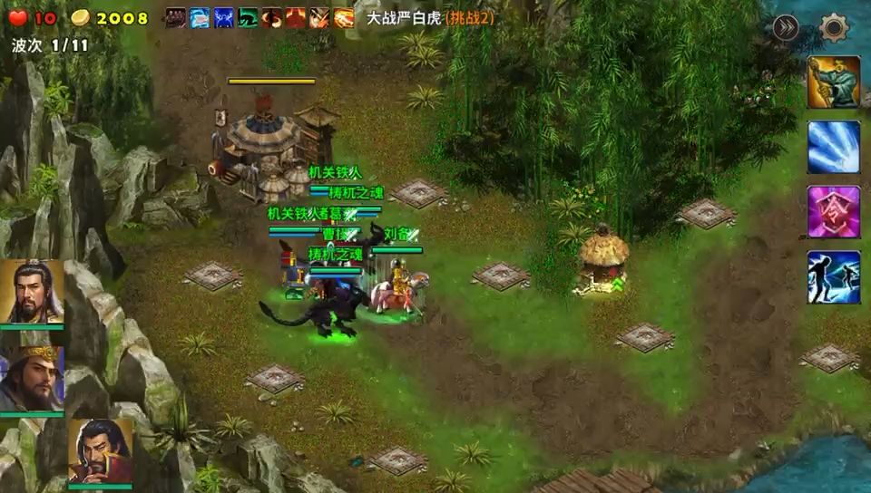 难度的关口都不用着急打,可以先把剧情打到极限尽可能的多升级塔防和战术卡和刘曹的等级提高,几个条件都到位后再打难度关口就得心应手了。大战严白虎这局开局三英雄参加,只要不离开大本营,敌人的两路进攻都会再合为一路,英雄以逸待劳很轻松拿下这关。