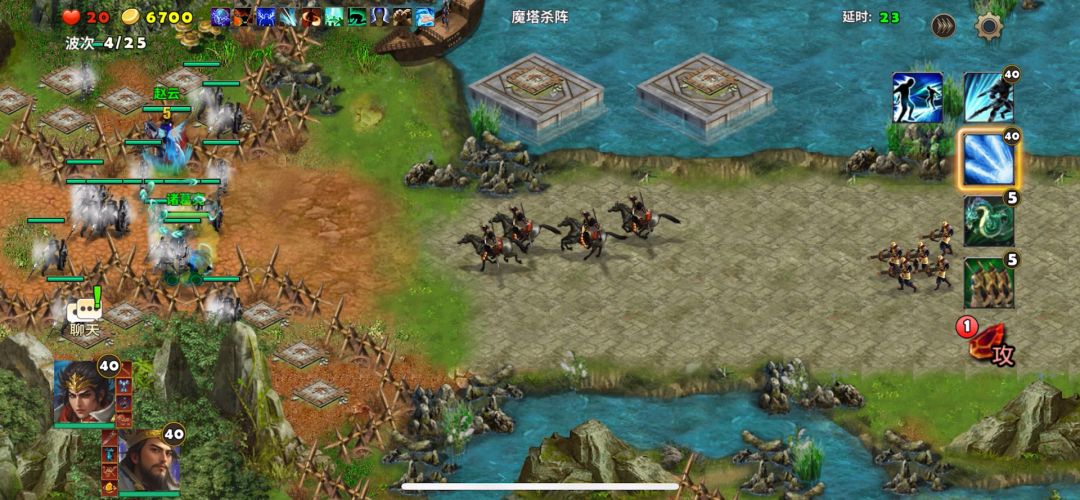 为了这局购买了一个赵云,以后的关卡赵云的用处很大的。开局选用天雷塔做辅助,武将贾诩和黄月英方前方,这两员武将打击范围大,攻击强。后面的安置按喜好自己安排就可以,因为后面压力小多了,还有大量的天雷塔防御。赵云做机动来回援助,胜率就大大增加了,曹操出来后后面的敌人就会大量的追来,尽量不要让曹操御敌,一点要安全到达大本营,否则游戏失败