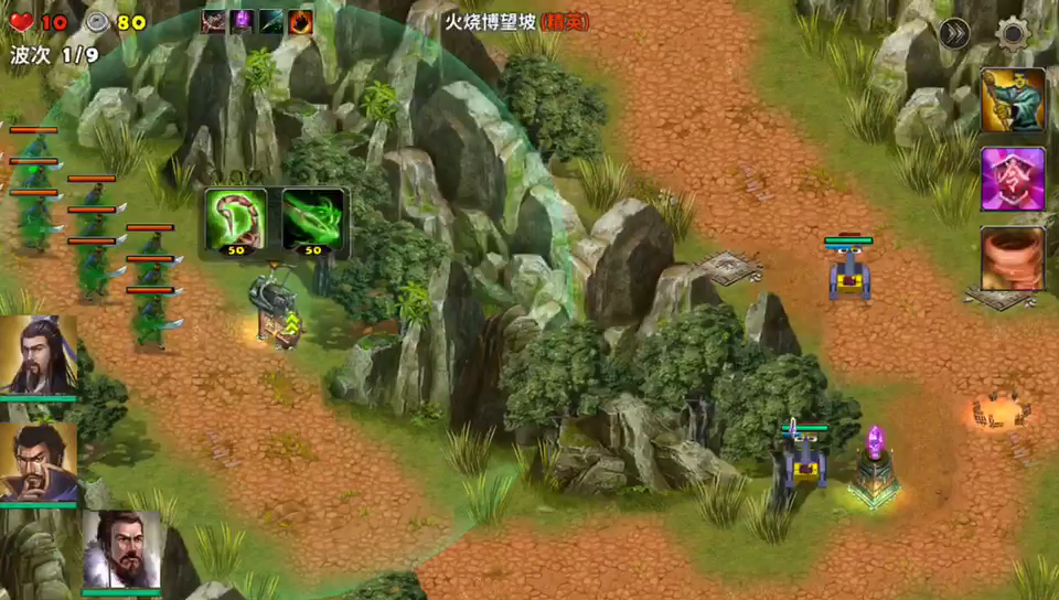 游戏前选好武将和你需要的塔防后,开局就快速建造。敌人分两路杀奔我大本营,左边的敌兵力不多,有上挺多的,建议左边用火焰塔杀敌,右边武将加火焰塔杀敌,最后的武将出来后,他到了我们火焰塔的攻击范围内,武将也上去,拿下他过关~!