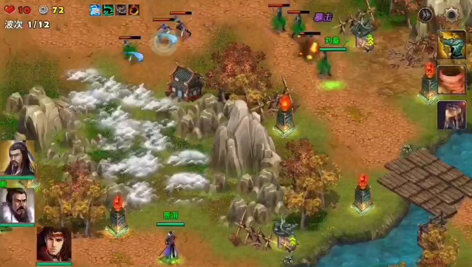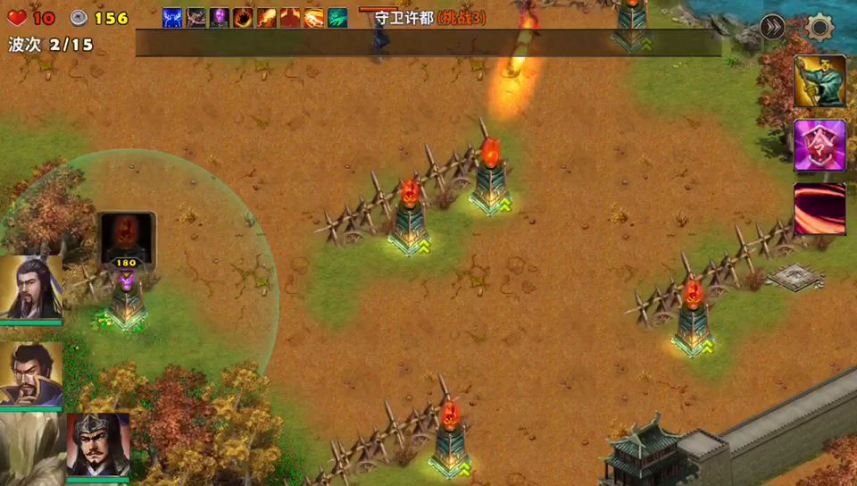 推图练武将还是次要的,主要是打塔防的碎片,也不知道什么时候存的碎片能到5级,开局选2个武将,用火焰塔助攻所选择的武将攻击敌人大本营的轮番进攻。尽量不要漏掉敌人,可在自己的大本营附近也建造几个火焰塔。挑战难度三星过了就有丰厚的奖励。