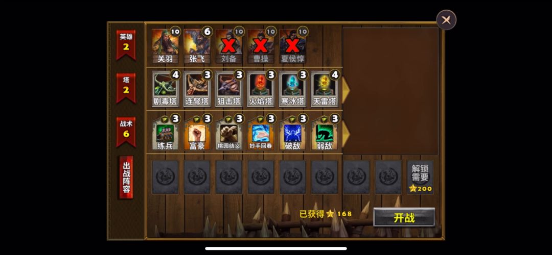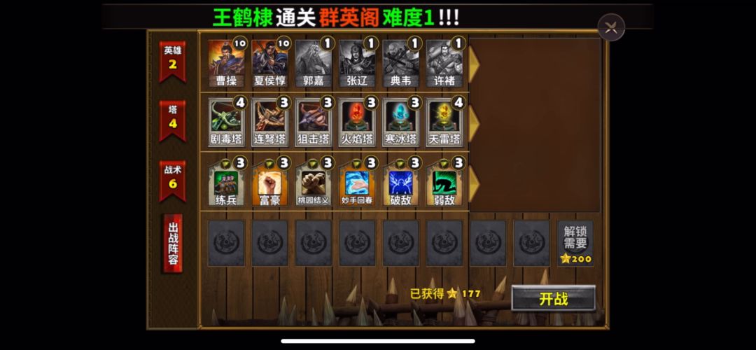 英雄选择刘备、张飞(顺便给张飞练级),防御塔使用剧毒塔、天雷塔,战术卡使用练兵、术塔精通、箭塔精通、剧毒新星,刘备、张飞装备如图所示 进入关卡地图,先在两个主要路口建造2座剧毒塔,剩下的金币用来升级防御塔,俩英雄分开防守两个路口,一切准备妥当以后,开战!这关没有boss,敌人都是一些小兵,总体实力不怎么强,随着一波又一波敌人被灭掉,收集的金币也越来越多,继续建造、升级防御塔,在我方英雄和防御塔