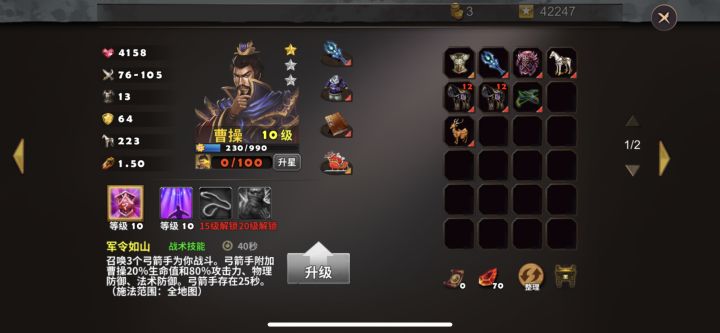 这关首次打只能使用曹操、夏侯惇,因为我没有其他曹营英雄,能不能使用其他曹营英雄现在还不知道,曹操、夏侯惇装备如图所示进入关卡地图,首先查看地图详情,敌我双方交战区域比较宽阔,先在前方建造2座剧毒塔,后面建造一座狙击塔,剩下的金币用来升级防御塔,两个英雄分开防守两边,一切准备就绪之后,开战!开始敌人比较弱,我方英雄配合防御塔可以轻松击杀敌人,随着一波又一波敌人被灭掉,我们收集的金币也越来越多,继