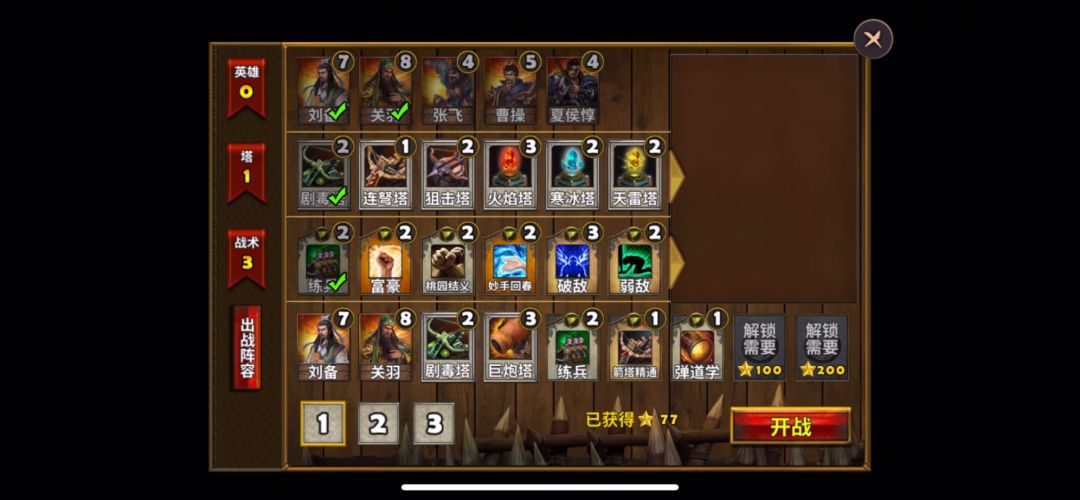 英雄选择刘备、关羽,防御塔选择剧毒塔、狙击塔,战术卡选择箭塔精通、练兵、破敌。进入关卡地图,首先建造防御塔,先在敌人出兵口附近和我方据点附近建造几座箭塔,留下一些金币升级防御塔,准备就绪后,开战!刚开始敌人的路线比较单一很好防守,打败敌人收集金币升级防御塔,提高防御塔攻击范围和伤害,后面敌人数量越来越多,属性也增加了,压力有点大,居然有一个敌人突破前面防御塔,还好后面增建了防御塔,成功击杀,终于