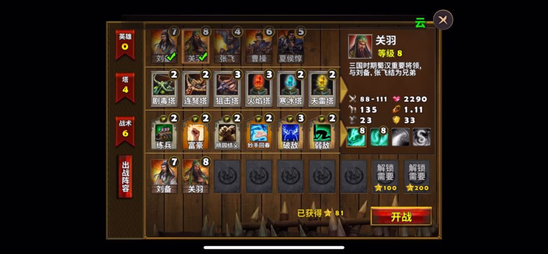 这关不能使用刘关张,萌新也没有其他英雄,只能使用曹操、夏侯惇,防御塔选择寒冰塔辅佐控制,天雷塔、巨炮塔输出,战术卡使用炮塔精通、弹道学。进入关卡地图,首先查看敌人出兵口,然后建造防御塔,一切准备妥当后,开战!后面留几个防御塔先不要建造,剩下的金币升级前面的防御塔,提高伤害,总共9波敌人,前面的敌人可以轻松应对,打败敌人获得的金币全部用来升级防御塔,后面的防御塔也可以建造了,终于等到最后一波敌人出