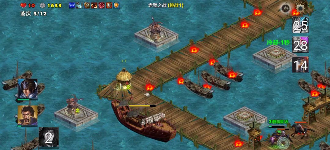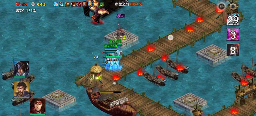 赤壁之战难度2和3感觉还是真的比长坂坡难的,主要难在不仅敌人加强,而且我方复活时间也加长,2级难度是10秒,3级加15秒,不仅装备要洗复活,而且要带减复活的卡。老套路,塔和飞龙吟去干死大船,然后赵云守水路,其他两个英雄守陆地。这里有狙击塔神火飞鸭很舒服的。