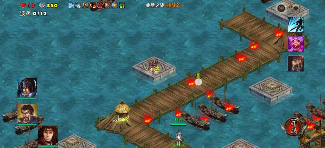 赤壁之战算是第六章第二难的一张图了,很多人认为比长坂坡难,但是作为被长坂坡连续失败5次的人来说,长坂坡对我来说噩梦般的存在。赤壁不仅需要防守12波源源不断的敌人,还需要前期把黑船快速打死,防止我方战舰被毁。可以带固若金汤,赵云带飞龙和神鹰令,可以拆黑船,造狙击塔狙杀黑船,造自爆船炸黑船。后面贾诩黄月英去阻击基地出来的地面部队,赵云留在港口配合塔击杀水面部队。