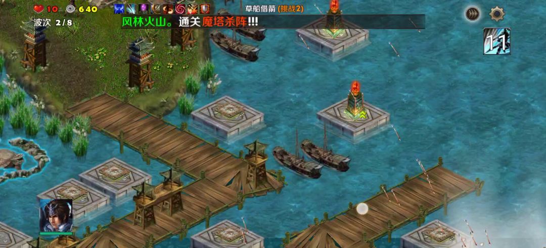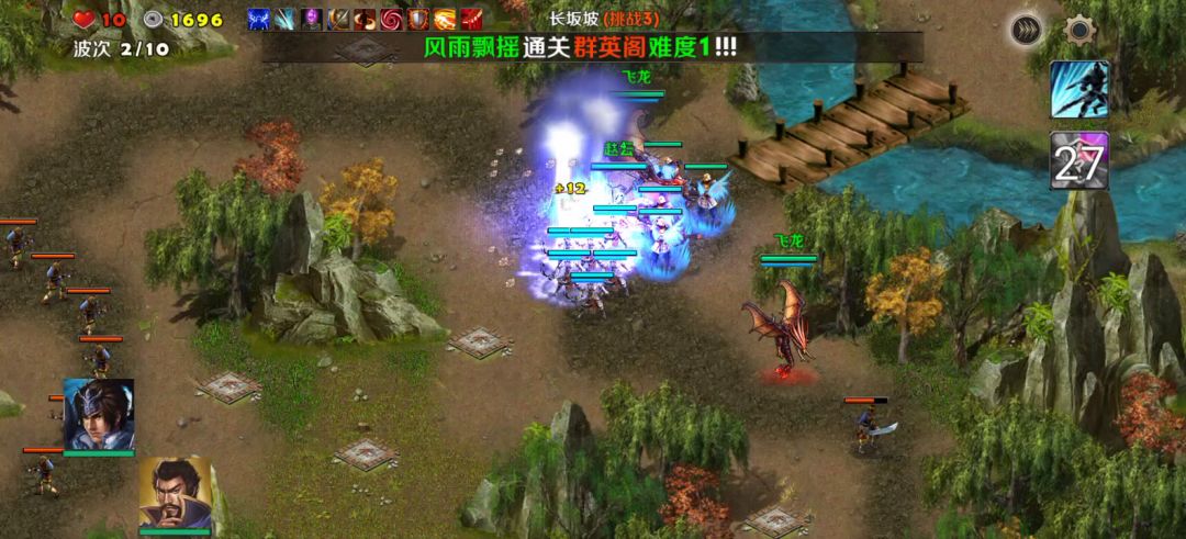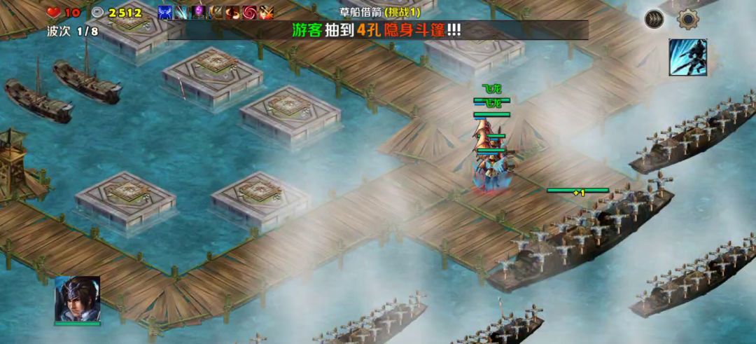 草船借箭难度2,和难度1没啥区别,就是有可能稍微难了一点吧,依然是问题不大,只要好好造塔就能过,暂时没研究出不造塔挂机的可能,因为只能带一个英雄,敌兵虽然不厉害但是挺多,一时半会清不过来。最好还是用初始的钱造一个塔比较稳妥。赵云飞龙属实很强,特别有了召唤祝福后,飞龙17秒持续时间,非常给力。