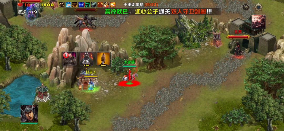 英雄推荐:太史慈防御塔:巨炮塔、擂鼓塔(难度三限制了很多塔只有炮塔类和辅助类防御塔可以使用)卡片出装:桃园结义、妙手回春、威震四方、破敌、弱敌、炮塔精通打法思路:开始以后在兵营里招募一次步兵然后太史慈先把右路关卡守将打掉并建造一座擂鼓塔加血技能点一下(带擂鼓塔是为了npc)太史慈再回头把缠住夫人的小兵清理掉以后迅速把关卡守将打掉在后头接应夫人直到夫人到达目的地终点。(本关要注意第一最好不要让