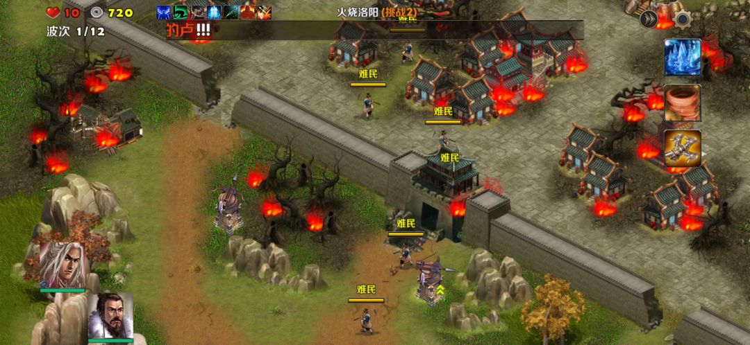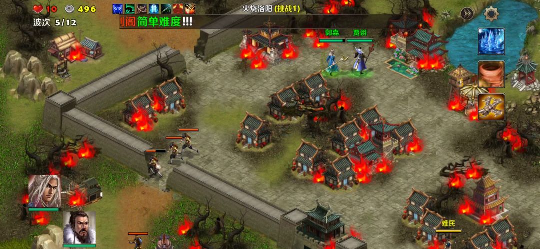 仓庭之战难度3,终于来了,这个图也是可以速推的,只要装备过关。这里全部造粮仓保证经历来源可以发兵。第四波有牛车,全部干掉,然后经济就源源不断了,可以不断发兵过去打。