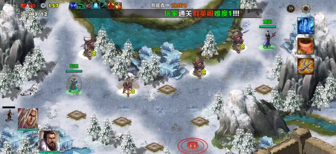 英雄:刘备、关羽塔:寒冰塔、天雷塔卡片、术塔精通、冻土、练兵、富豪打法:参考视频